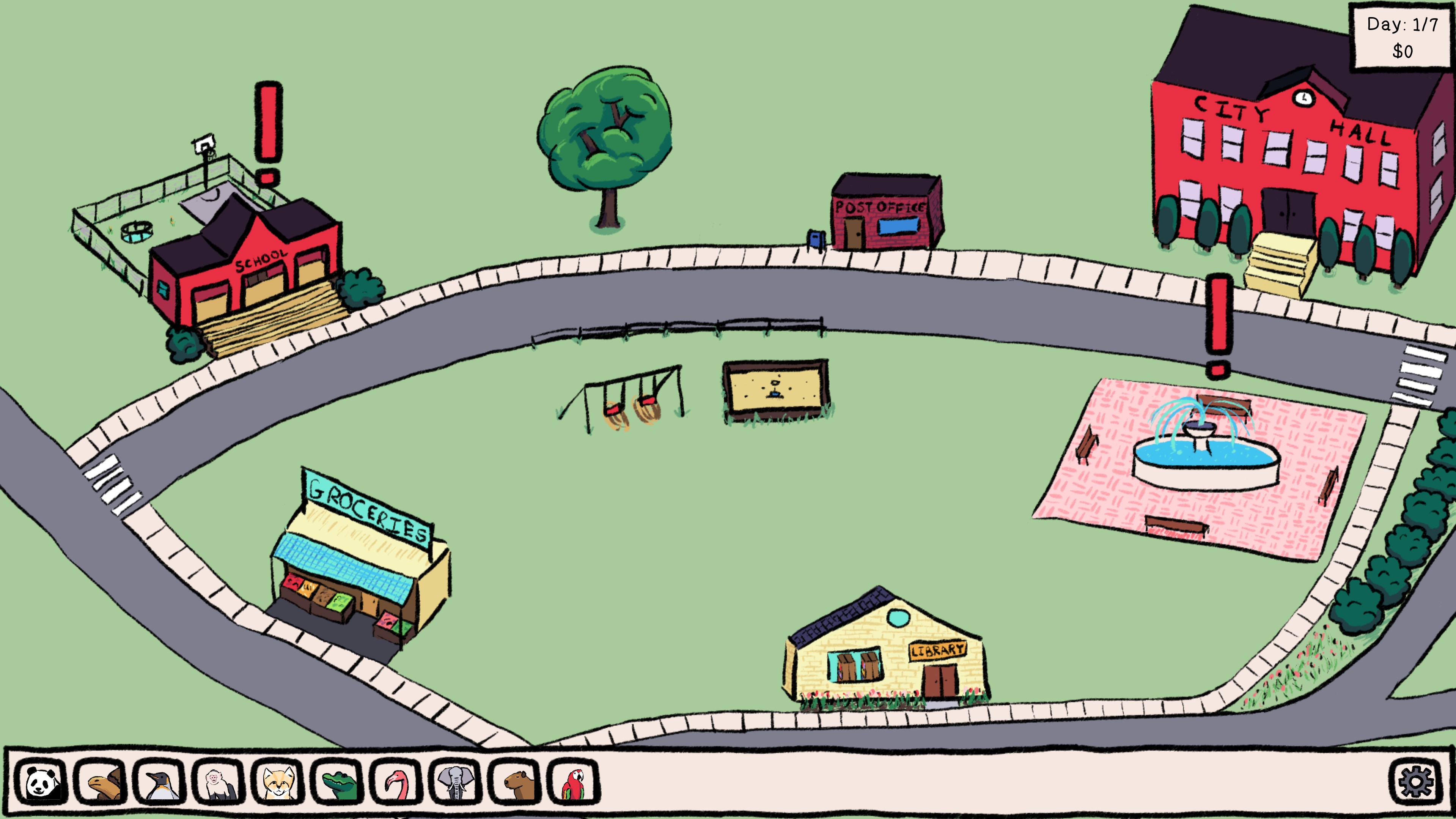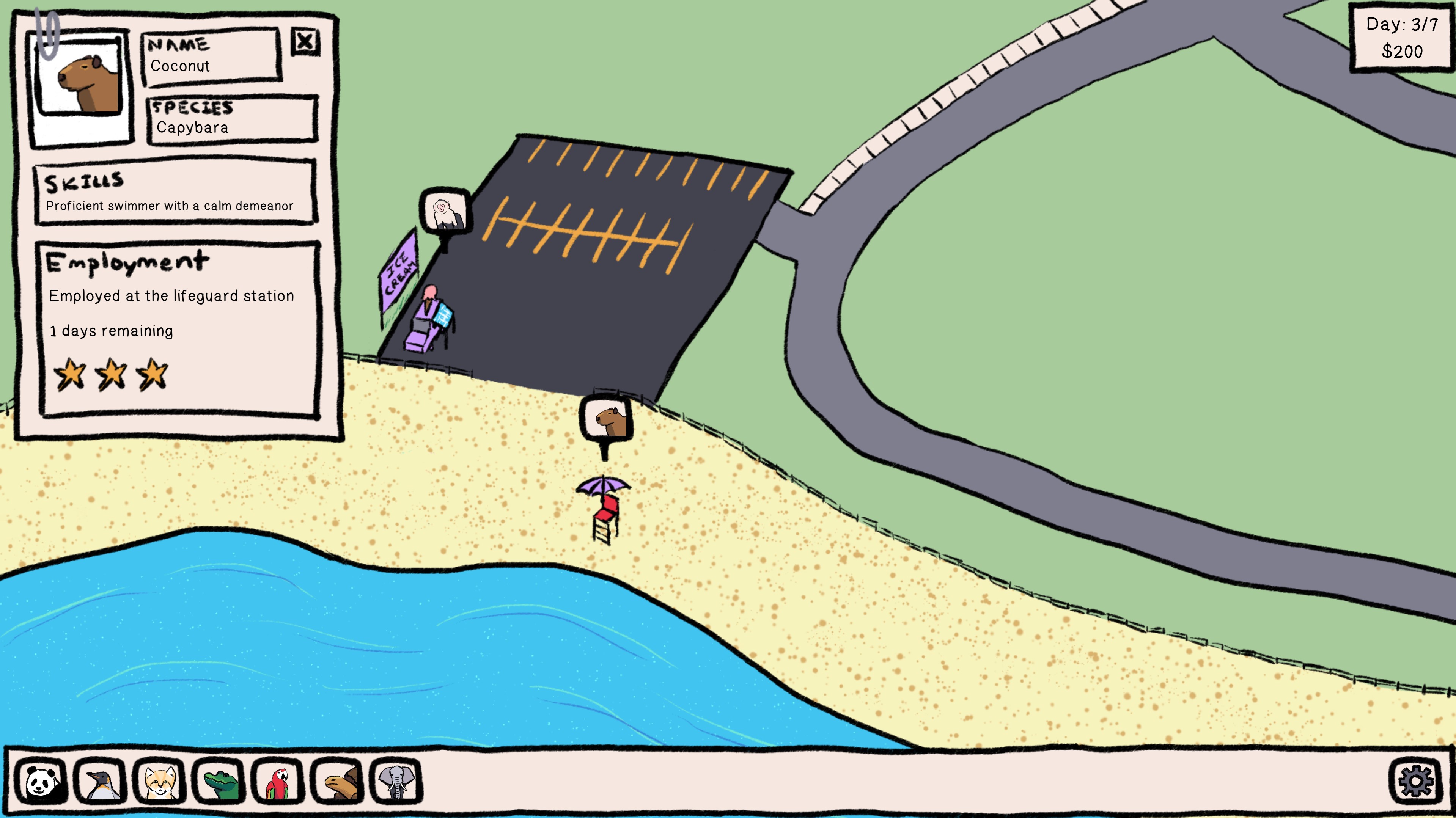 Select animals from the bar at the bottom to view information about them and to assign them to open jobs. Locations with open jobs are indicated by an ad in the classifieds section of the newspaper and an exclamation point above them. When all job openings have been filled for the day, the player can continue to the next day. Animals are rated out of three stars, and they earn $10 for each star.